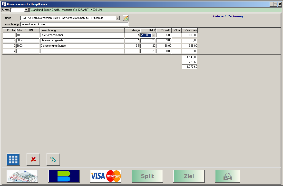Freie Erfassung in Tabellenform. In den Stammdaten hinterlegte Kunden- und Artikeldaten fördern die schnelle und sichere Erfassung von Rechnungen und Gutschriften.
