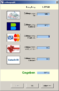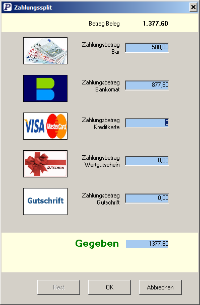 Zahlung mit mehreren Zahlungsmitteln innerhalb eines Vorgangs. Kein Problem, einfach die erhaltenen Einzelzahlungen erfassen und Restbetrag, Überzahlung bzw. Wechselgeld anzeigen lassen.