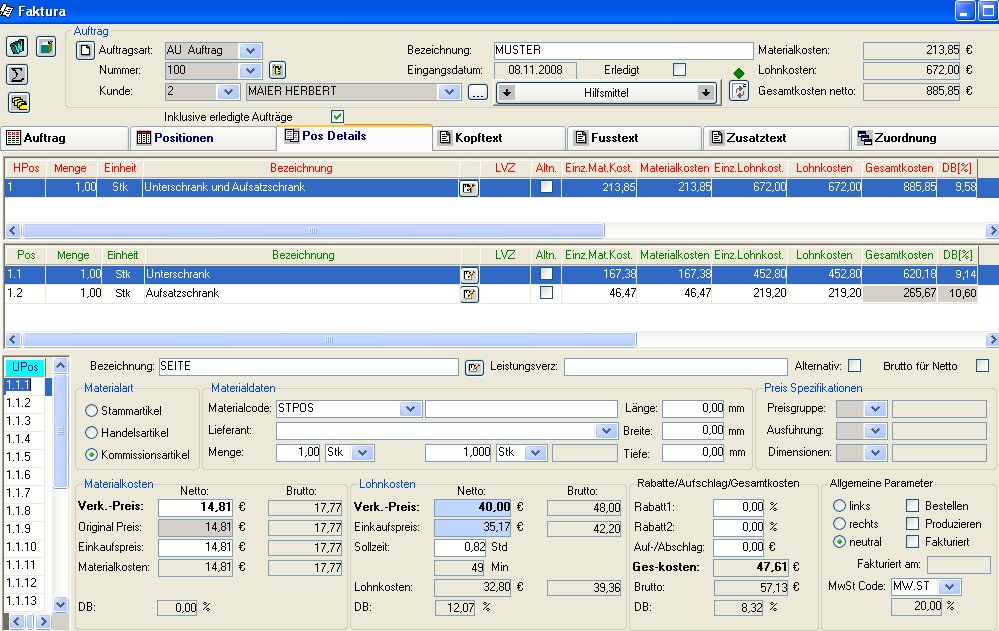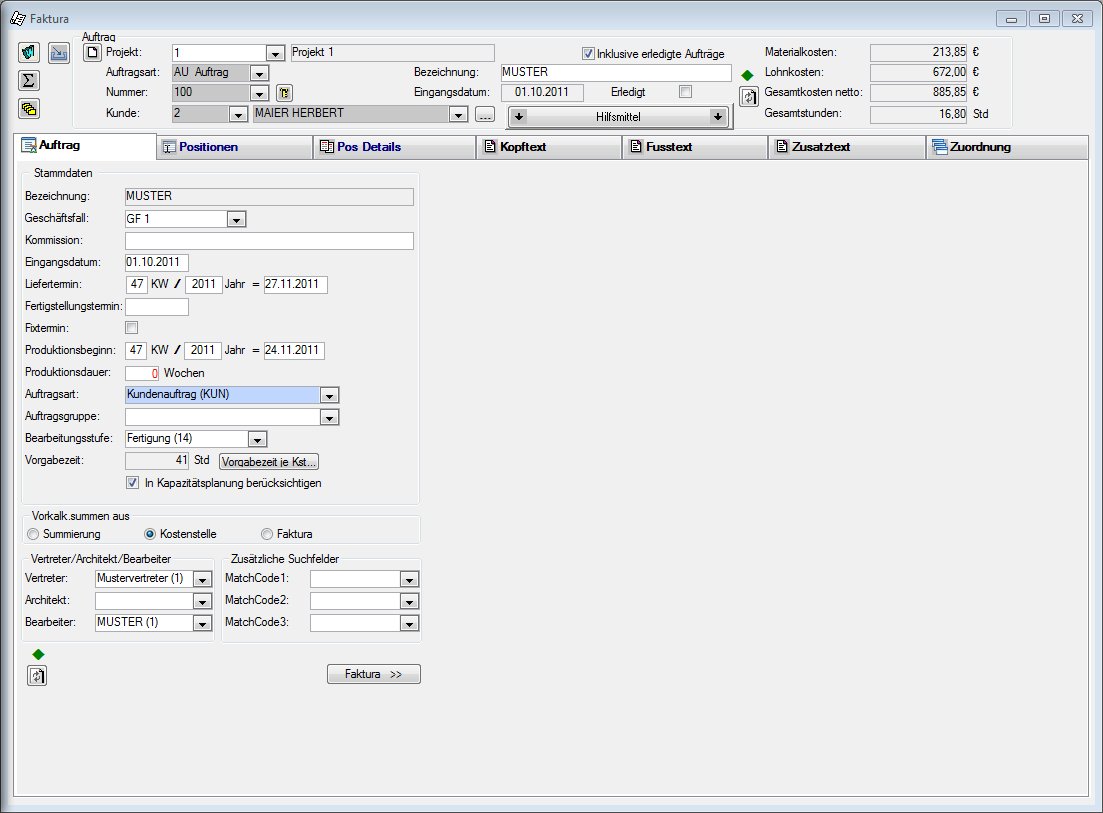 Anlage von Stammdaten wie Kunden Architekten, Vertreter, Personal, Kalkulationssätze, Materialstamm,